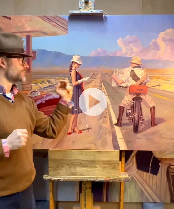 The exhibition features his signature aviators, soaring skyscrapers, and sweeping skies. Inspired by vintage travel posters and the golden age of flight, the paintings balance bold color and clean geometry with quiet, contemplative moments high above the city.